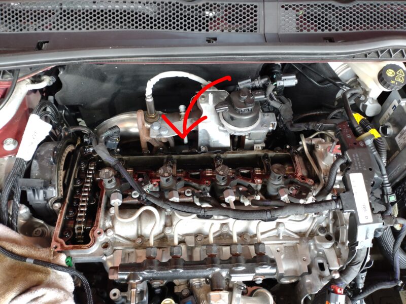 画像赤矢印部分から車体後ろ側にエンジンオイルが漏れ、漏れた下にあるマフラーに当たり、煙が発生し、室内のエアコン吹き出し口から煙が車内に入ってしまっていたのだと思います!