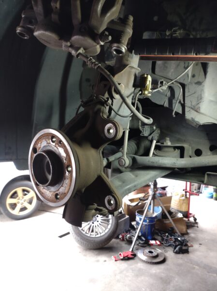 フロントのブレーキパッド、ブレーキキャリパー、ブレーキキャリア、ブレーキローターを取外した画像になります。