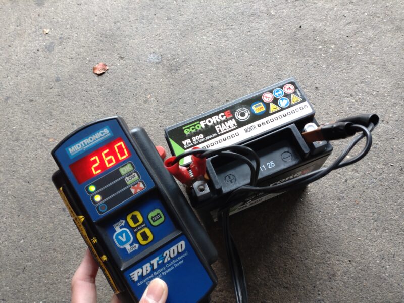 新品のサブバッテリーをテスターを使いCCAの数値を測定した画像になります。