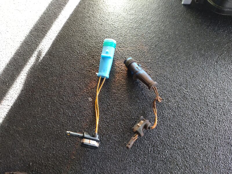 ブレーキパッドに組込んであり、ブレーキパッドが減ってくるとパッドセンサーがブレーキローターに接触し、破損する事により警告灯が点灯する仕組みになっております!