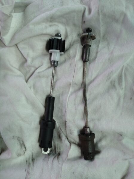 左が新品、右が古いパーキングブレーキケーブルになります。