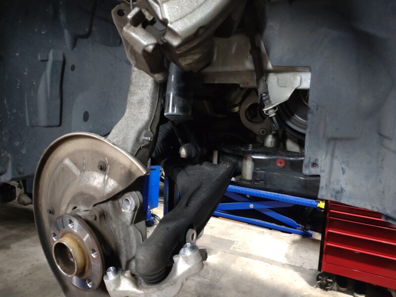 フロントドライブシャフト(右側)を取外す為に、ロアアーム、ブレーキ関係、フロントショック、アッパーアームを取外した画像になります。