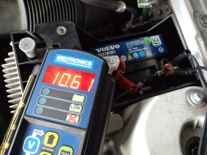 お車をお預かりしている間にスピードメーター内のディスプレイにサブバッテリー点検のエラーが表示された為、テスターにてサブバッテリーの電圧を測ってみると10.61Vしかありませんでした。