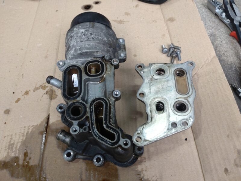 オイルエレメントハウジングにはオイルクーラーが取付されていますので、分解し、両方のガスケットを交換します!