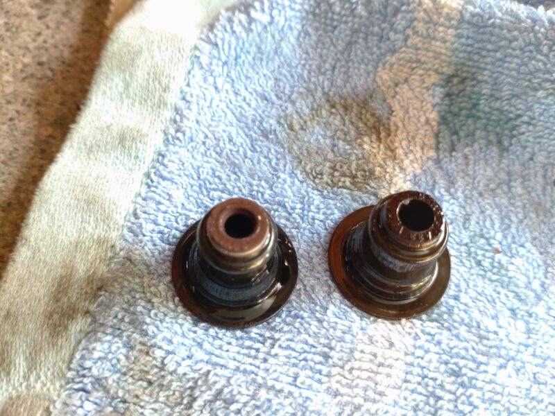 すごくわかりにくいのですが、右の古いバルブステムシールの穴が新品に比べるとほんの少し大きくなってしまっています!この少しが原因でエンジン内部にエンジンオイルが入ってしまい、白煙とオイル減りの原因になってしまいます!